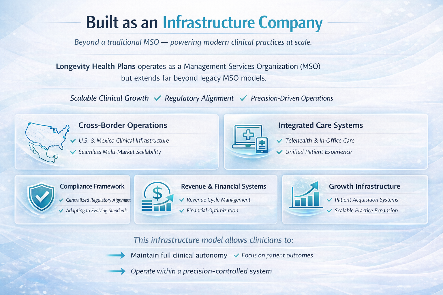 Longevity Health Plans is structured as a Management Services Organization (MSO), but our scope extends far beyond traditional MSO models. We provide the operational backbone that enables modern medical practices to function at scale, without compromising clinical integrity or regulatory compliance