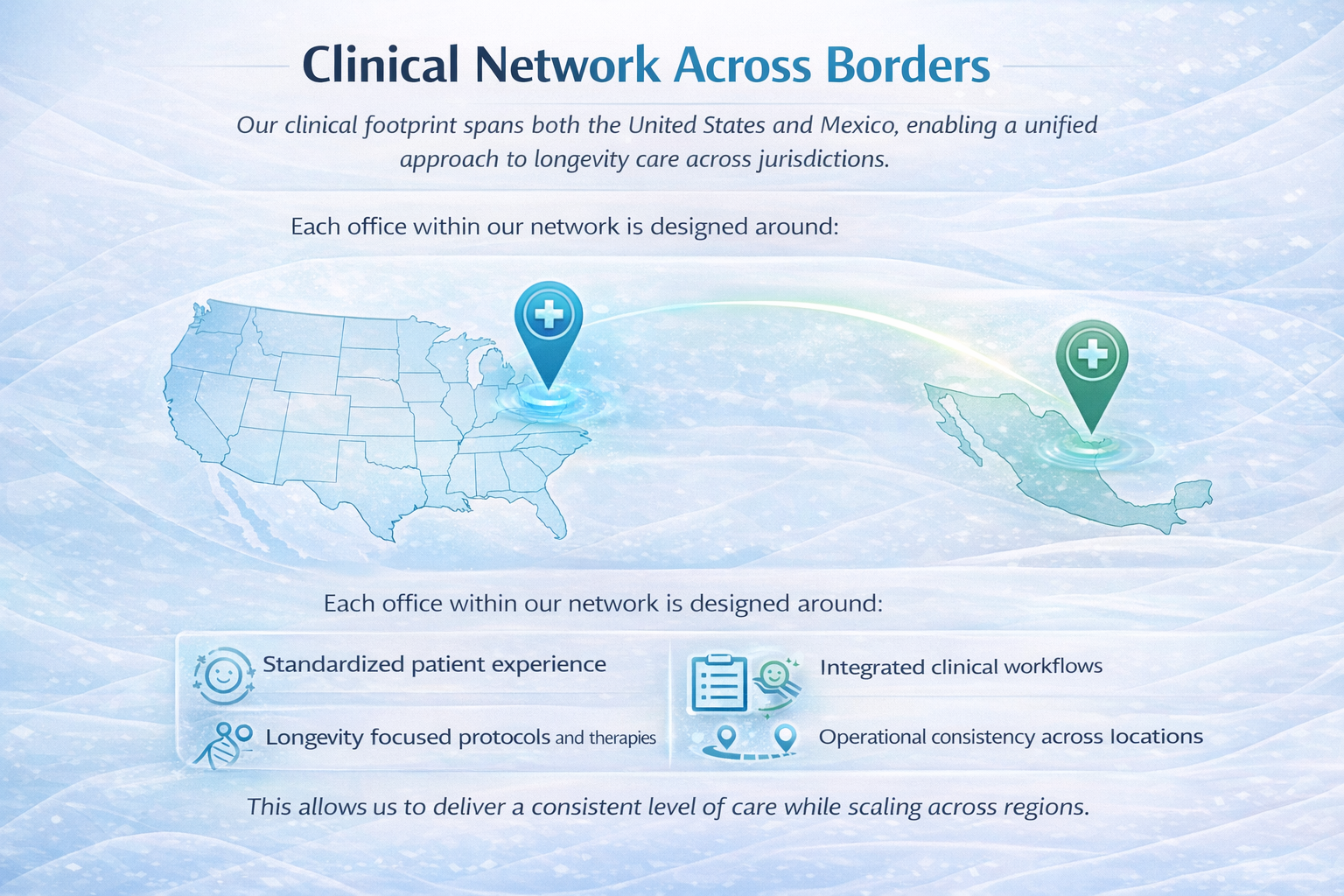 Our clinical footprint spans both the United States and Mexico, enabling a unified approach to longevity care across jurisdictions.